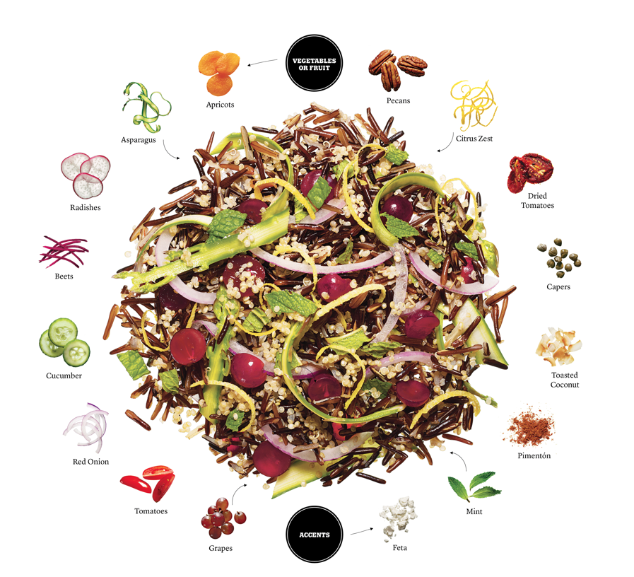 And the grain choices are; wild rice, rice, bulgur, farro, quinoa, pearled barley, steel cut oats, or couscous. The idea is to mix 2 cups cooked grain, 1 cup fruit, vegetable, or both, and some flavorful accents. Next, toss with a nice vinaigrette.